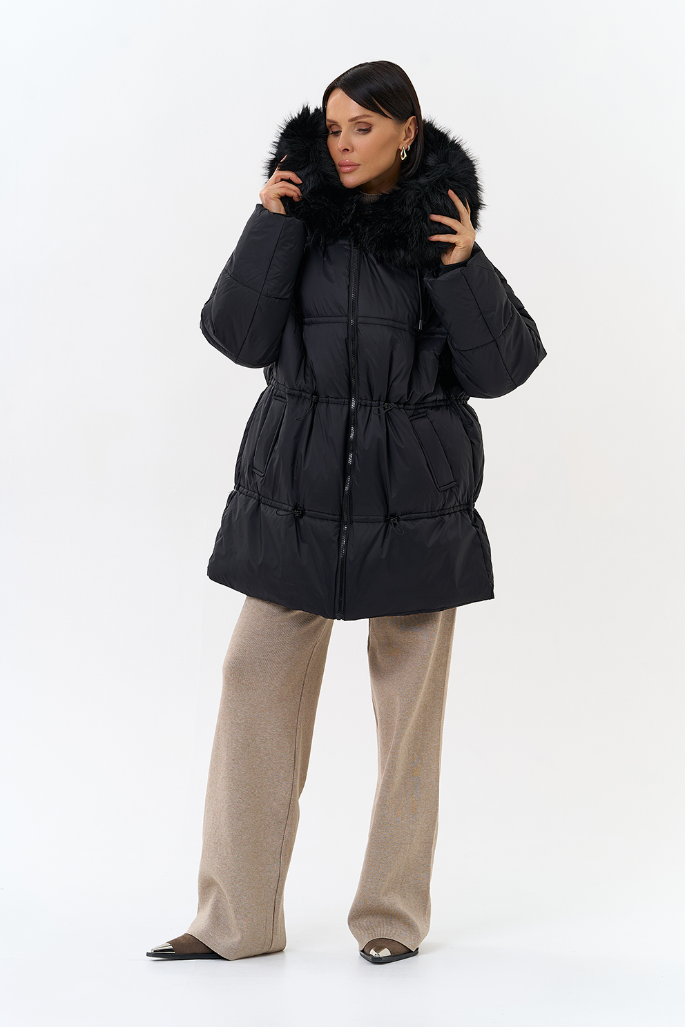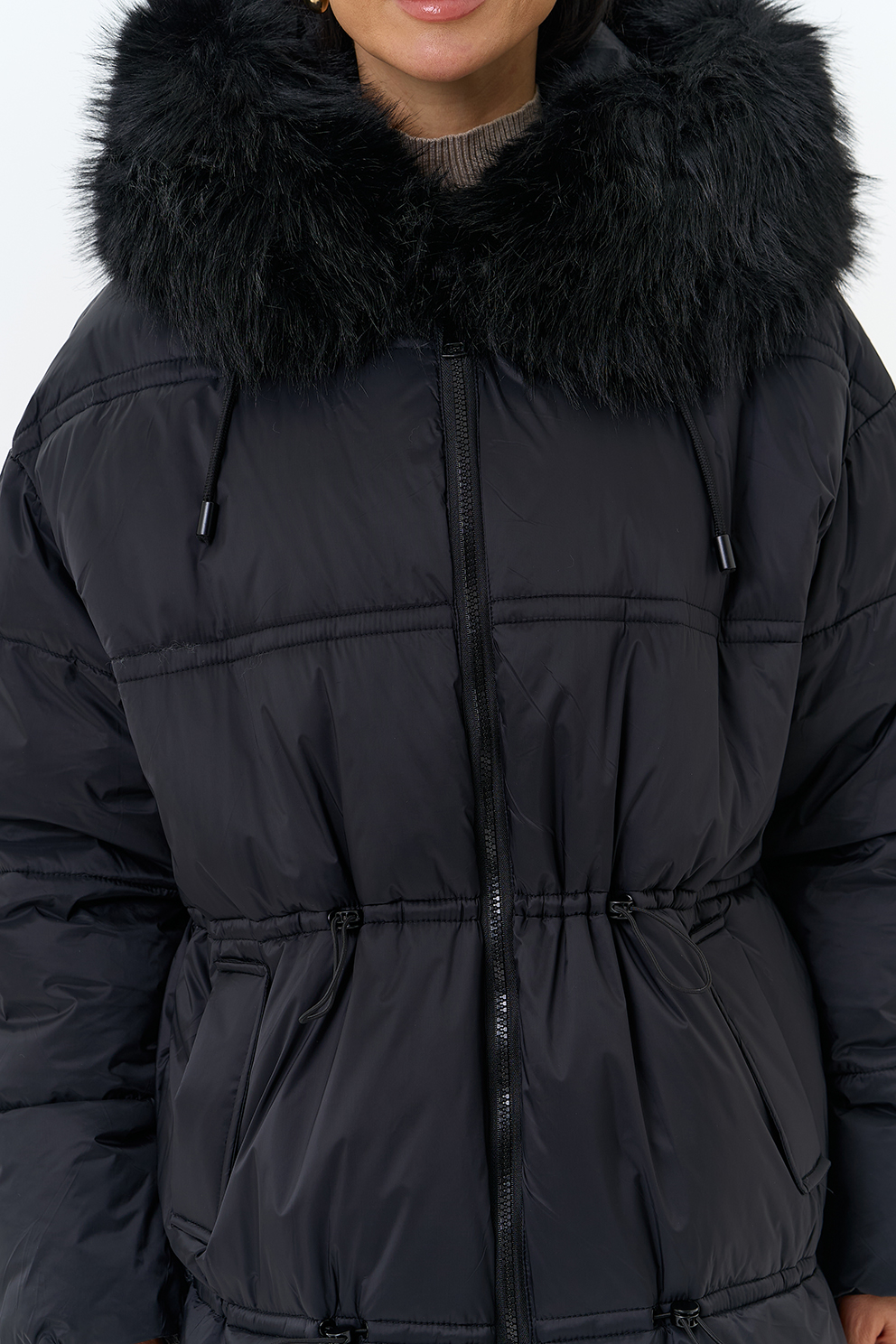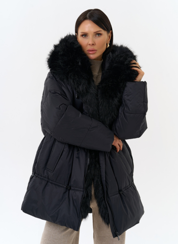 Крой воротника - капюшон, отделка искусственный мех